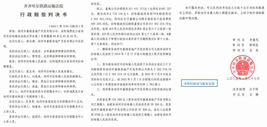 该判决书在事实认定部分称,经审理查明:一号地块项目系讷河市拉哈镇棚户区改造项目......2016年2月14日,平安公司拉哈分公司向讷河市发改委提交立项申请,拟按棚户区改造政策开发建设隆德嘉园小区......2018年6 月29日,嘉缘公司成立,隆德嘉园小区更名为拉哈镇状元府邸。2019年7月17日,嘉缘公司与拉哈镇政府签订开发保障协议。同年 7 月 25 日,一号地块一期1-4号楼项目已完成征收工作。嘉缘公司成立后,实施了一号地块地形图堪测等工作;同年9月6日举行动工仪式,拉哈镇政府副镇长出席;同年10月,政府强行要求嘉缘公司对两栋回迁楼基础进行施工,施工时未取得国有土地使用权、建设工程规划及施工许可;同年 11月末,两栋楼基础施工结束。2020年3月,讷河市原副市长告知被征收户一号地块项目取消,对被征收户异地安置。相隔2年拉哈镇政府于2022年3月14 日作出限期履行通知书,委托第三方评估两栋楼基础造价费为 915174.74元,组织召开解除开发保障协议事项听证会。2022年6月23日,拉哈镇政府作出终止和解除行政决定,要求嘉缘公司撤离施工现场,补偿两栋楼基础造价费,返还平安公司拉哈分公司缴纳的征收保证金500000元及嘉缘公司支付被征收户房屋购买费240000元,共计1655174.74元......