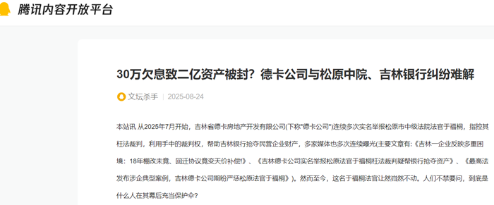 本站讯 从2025年7月开始,吉林省德卡房地产开发有限公司(下称"德卡公司")连续多次实名举报松原市中级法院法官于福桐,指控其枉法裁判,利用手中的裁判权,帮助吉林银行抢夺民营企业财产,多家媒体也多次连续曝光(主要文章有:《吉林一企业反映多重困境:18年棚改未竟、回迁协议竟变天价补偿!》、《吉林德卡公司实名举报松原法官于福桐枉法裁判疑帮银行抢夺资产》、《最高法发布涉企典型案例,吉林德卡公司期盼严惩松原法官于福桐》)。然而至今,这名于福桐法官让然岿然不动。人们不禁要问,到底是什么人在其幕后充当保护伞?