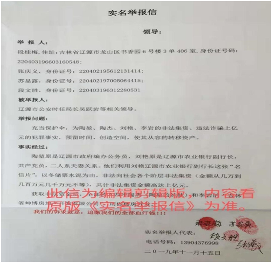 2015年10月15日,我们数十家受害人到辽源市公安局报案,辽源市公安局经侦以各种理由对该案不予立案。后来,在吉林省巡视组领导的关注下,才得到立案调查。这期间,公安的时任局长吴跃岩等相关领导已经给陶堃、陶杰、刘艳、李岩等人,预留出时间、创造了空间,从容的将资产转移完毕。