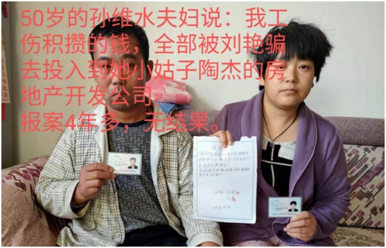 5、老百姓愤恨的说:“由于公安局故意的不作为和慢作为,给犯罪分子创造了资金转移的空间。在此时间内,犯罪分子刘艳利用这个空间将非法集资、违法诈骗老百姓的资金全部转移到小姑子陶杰及私下合伙人李岩的名下。