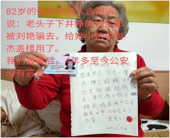 他们一生积攒的养老钱,血本无归。现在基本生活无法保障十分困难,身患重病无钱医治。只能在家硬靠死等,凭天由命。因此,老百姓对当地公安失去希望和信任,认为他们不作为、相关领导成为地道的保护伞。