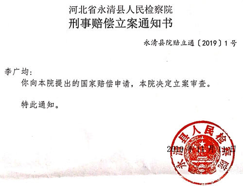 据悉,李广军重新获得自由后,于2019年8月18日按照法定程序向永清县检察院提出国家赔偿申请,检察院于10月未通知李已经立案受理,并于11月11日做出《刑事赔偿立案通知书》(永清院陪立通{2019}1号)。但是,在给李邮寄《刑事赔偿立案通知书》时,却因为李留的地址不详未能送达被退回。