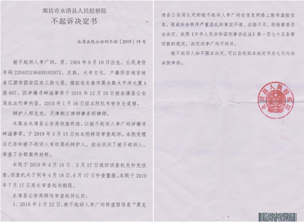 李广军回忆说:接下来的几次提审,警方还是如法炮制,但是提审他的经常是新面孔,有的警察(或协警)甚至明确告诉李:“你这个破案子没人爱管!”“我们只是帮忙的!”就这样一天天的熬,李终于熬过了两次补充侦查。卷宗到检察院后,律师认真研究过卷宗并亲往东北调查后,最终认定李是无罪的,警方指控李发布虚假信息扰乱社会秩序(即寻衅滋事)的证据根本就不存在。之后,一份加盖了律师事务所公章的律师意见被送到了永清县检察院检察长和办案人手中。永清县检察院先是做出了延期审查起诉的决定,之后又认真听取了律师意见并提审了李广军。2019年7月31日,永清县人民检察院做出不起诉决定书(永清县院公诉不诉{2019}19号),“认为永清县公安局认定的被不起诉人李广均在信息网络上散布虚假信息,造成社会秩序严重混乱的事实不清、证据不足,依照《中华人民共和国刑事诉讼法》第一百七十五条第四款的规定,决定对李广均不起诉。”至此,在经历了长达八个多月的摧残后,李广均终于走出大牢。