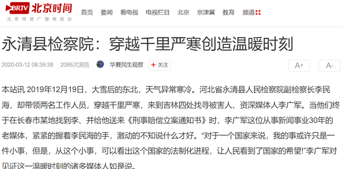 本站讯 2019年12月19日,大雪后的东北,天气异常寒冷。河北省永清县人民检察院副检察长李民海,却带领两名工作人员,穿越千里严寒,来到吉林四处找寻被害人、资深媒体人李广军。当他们终于在长春市某地找到李、并给他送来《刑事赔偿立案通知书》时,李广军这位从事新闻事业30年的老媒体,紧紧的握着李民海的手,激动的不知说什么才好。“对于一个国家来说,我的事或许只是一件小事,但是,从这个小事,可以看出这个国家的法制化进程,让人民看到了国家的希望!”李广军对见证这一温暖时刻的诸多媒体人如是说。