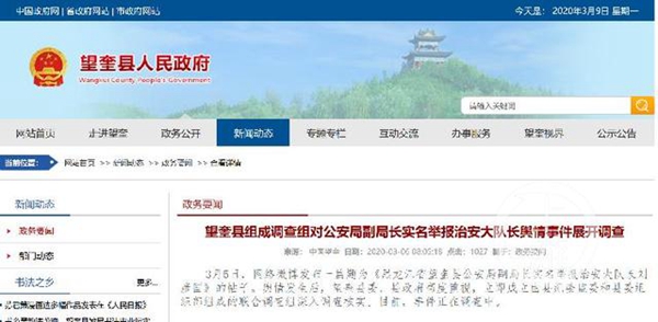 上游新闻记者发现,3月6日,望奎县人民政府官网上发布《望奎县组成调查组,对公安局副局长实名举报治安大队长事件展开调查》一文,证实了望奎县公安局张局长的上述说法。