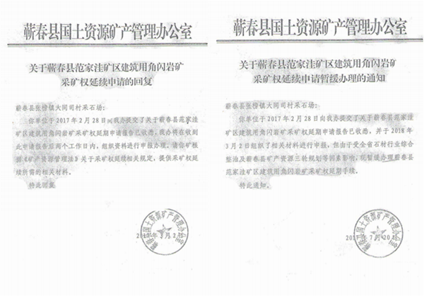 2017年3月2日,蕲春县国土资源矿产管理办公室(以下简称县矿产管理办公室)回复采石场:将在收到此申请报告两个工作日内,组织资料进行申报办理并请采石场提供采矿权延续所需相关资料。
