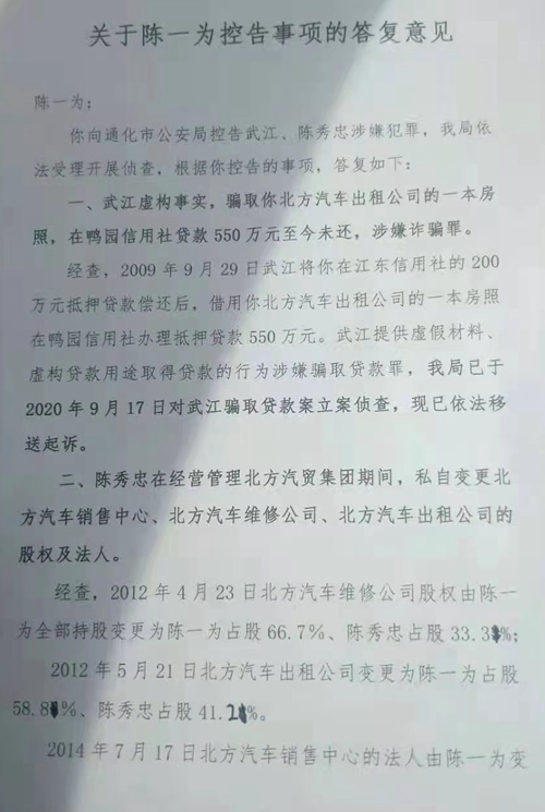 “我是吉林省通化市北方汽贸集团(简称北方汽贸)董事长陈一为。自2010年以来,通化市超越高科电子有限公司(简称超越高科)董事长武江精心设计骗局,诈骗我和银行贷款7000多万元。对于此事,武江本人承认,还有多名证人证明和大量书证、录音证据佐证,但通化警方却认为未发现武江的犯罪证据,至今也不抓人,致使一个好端端的企业——北方汽贸濒临破产,而真正的涉嫌套路诈骗严重犯罪的武江至今仍未受到法律的严惩。