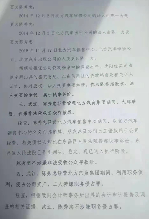 “答复意见”中第四项称,武江、陈秀忠经营北方汽贸集团期间,利用职务的便利,侵占公司资产,二人不涉嫌职务侵占犯罪。公安机关在一年的调查、审计中,并没有针对涉案的资金来源、去向针对性的开展审计,而是审计企业盈亏状态,而对于我举报陈秀忠涉嫌职务犯罪的主要证据却置若罔闻,此种做法令人不能理解。我们提出陈秀忠利用职务之便,将公司修理厂、楼顶屋面出租得到近四十万资金,全部据为己有。另外还利用公司资金77万多元为自己购买房屋。这些证据早就提交给了公安机关,公安机关既不调查,也不说明情况,这是赤裸裸的包庇犯罪行为。
