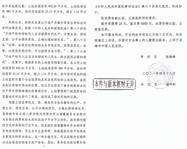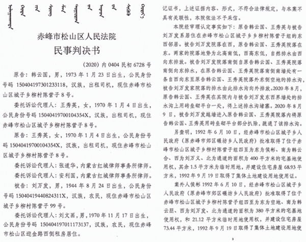 本站讯 2021年4月18日,内蒙古赤峰市松山区人民法院(主审法官是张晓峰),对一起拆除花池子引发的诉讼,做出(2020)内0404民初6728号民事判决书,令人没有想到的是,本来只是一点点小事,竟引来了巨大争议:原告韩云国、王秀英坚持认为,其购房之时院内根本就没有排水沟,是法官自己用猜测、分析为被告刘万发杜撰出了一条排水沟,他据此提起上诉。此事在当地引起了不小的风波。