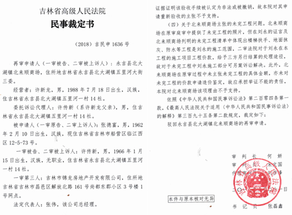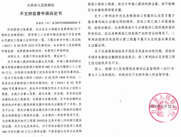 但许传新仍然不服,2017年、2018年,许分别将上述两案提请吉林省高级人民法院申请再审,吉林省高院分别做出(2017)吉民申2261号及(2018)吉民申1636号裁定,均驳回许传新和北来顺商场的再审申请。许传新又到吉林市和吉林省检察院申请审判监督。之后,吉林市检察院做出吉市检民(行)监【2018】22020000003号不支持监督申请决定书,吉林省检察院也做出了吉检民(行)监[2019]22000000034号不支持监督申请决定书。