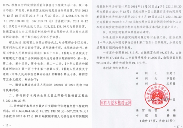 2015年,张德富将许传新的两个工程(大市场综合楼和北来顺商场)同时诉至永吉县法院。永吉县法院于2016年6月8日和5月24日分别作出了(2015)永民一初字第1031号和(2015)永民-初字第1032号两份判决书,分别判定许传新给付工程款694.4万元和487.2万元,两项合计1181.6万元。许传新不服一审判决,上诉至吉林中院,吉林中院通过开庭审理,做出判决,维持原判。而(2015)永民一初字第1032号判决是由刘任城主审,以双方当事人不同意做工程造价鉴定为由发回重审。发回重审后,永吉县法院副院长邓永刚主审以同样的理由改判,驳回张德富的全部诉讼请求(详见【2017】吉0221民初5号判决书)。无奈,张德富又上诉到吉林中院。2017年12月20日,吉林中院通过开庭审理,作出了(2017)吉02民终2522号终审判决,认定(2017)吉0221民初5号判决适用法律错误,依法判决许传新给付张德富工程款340多万元及利息。以上两判决均是终审判决并已经生效。