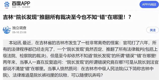 本站讯 最近,在吉林省的吉林市发生了一桩非常离奇的怪案:官司打了六年,所有的法律程序都已经走完了,一个“院长发现”竟然否定、推翻了所有法律裁判(包括上级法院、检察院的裁决),但是至今却依然不知道“院长发现”的所谓“错误”“错”在哪里!两年来,当事人一直在反复追问:“院长发现”的所谓错误究竟在哪?可是从院长到法官都说不清楚“错”在哪里。当事人愤然质问:在吉林市中级人民法院(以下简称吉林中院),法律难道是院长裤裆里的玩物,可以随便玩弄吗?