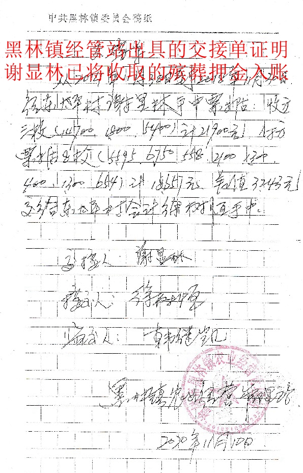 据二审判决书记载,二审期间,谢显林的辩护人提供的第二组证据有:(1)东太平村村委会出具的证明一份,证实东太平村6组道北经济林地所有权和经营权是东太平村村委会。2014年周文喜强行在村集体林地里种植玉米,周文喜和村里签订的林地合同是在村里打药后签订的经营合同。(2)2011年到2013年会计凭证,证实黑林镇东大平村在2011年到2013年每年均入账经济林发包款,用于证实周文喜等人每年都向村里交费,所耕种土地是村里的机动地。