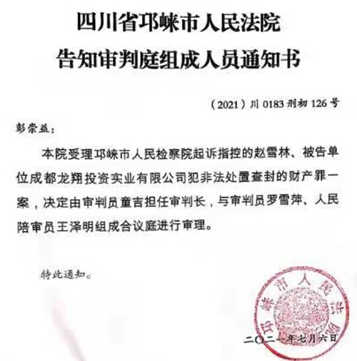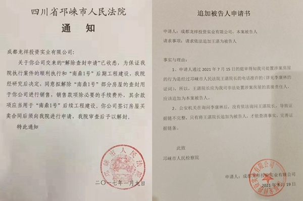 本站讯 近日,记者从四川省成都龙祥投资实业投资有限公司(简称龙祥实业公司)处得知,该公司在其涉嫌犯有非法处置查封财产一案中,将负责审理该案件的邛崃市人民法院的院长王湛申请追加为被告人。申请书的内容为——
