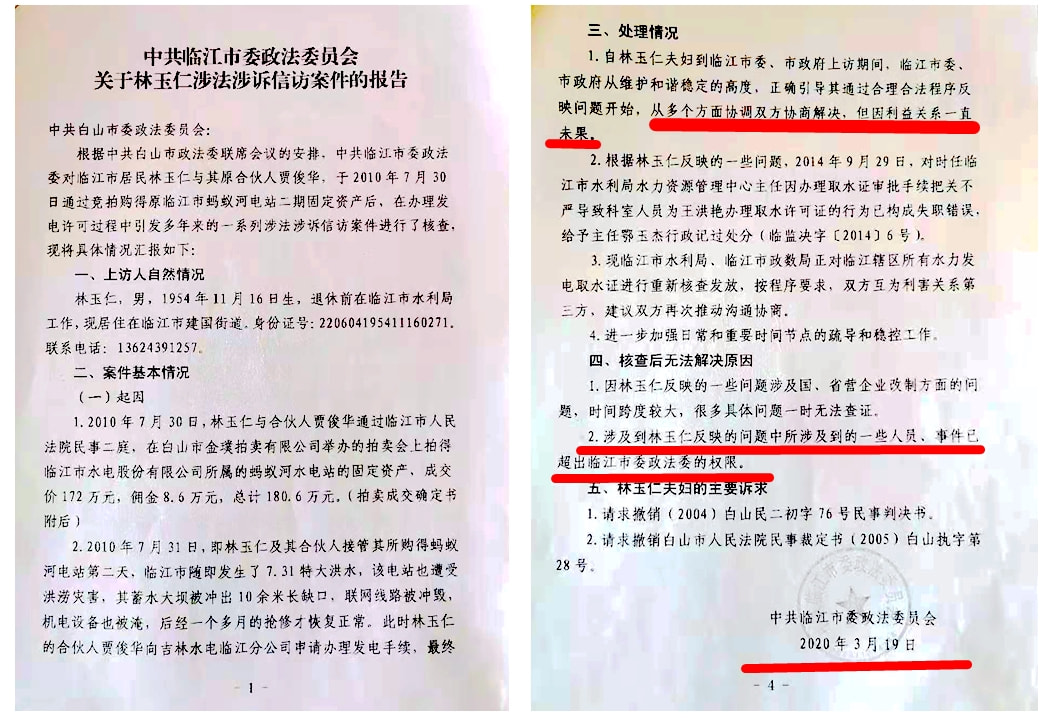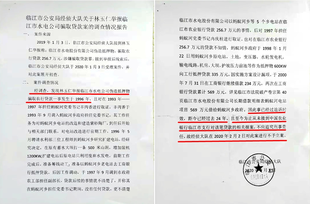 (二)林玉仁在持续多年的信访诉求过程中,获取到临江市公安局经侦大队对临江水电公司骗取贷款案的“情况报告”,证实:“临江市公安局于2020年1月3日立案调查,先后调取了原蚂蚁河乡党委书记冉庆祝、丰丙香证言,均证实临江水电公司用蚂蚁河乡电站抵押贷款情况不知情。由于过了追诉时效,亦未接到农业银行临江市支行的报案,不应追究刑事责任,故2020年2月2日对此案不予立案”。由此可见,枉法裁判导致金融诈骗犯罪分子至今逍遥法外。