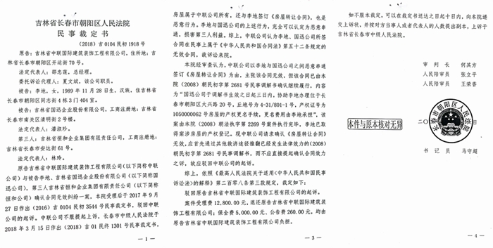 公开资料显示,早在2018年3月15日,吉林省长春市中级人民法院就做出了(2018)吉01民终1301号民事裁定:一、撤销朝阳区法院(2016)吉0104民初3544号民事裁定;二、指令朝阳区法院对本案进行审理。至此,发生在长春市的因法官用空白信造假引发的旷日持久的房地产争夺大战,似乎看到了尽头。但是,朝阳区法院却又玩起了拖延战术和文字游戏,四名法官相互挡剑、背书,找出种种理由拒不纠错!在全国政法队伍整顿的大背景下,关于此案的种种奇葩裁定令人十分震惊。