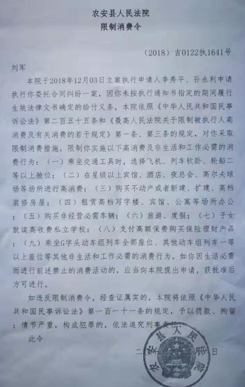 2015年7月29日,刘军将二人的房屋以70万元出售给苗建。孙永利认为,房屋为171.36平方米,就卖70万元,价格太低了,侵害了孙永利的权利,遂向农安县法院提起诉讼,要求刘军赔偿孙永利30万元。经审理,农安县法院下达了(2017)吉0122民初第5065号民事裁定书,驳回孙永利的诉讼请求,孙永利不服一审判决提起上诉。长春市中级法院经审理后,下达了(2018)吉01民终2244号民事判决书,判处刘军赔偿孙永利夫妇50717.58元。判决生效后,孙永利申请强制执行,农安县法院执行局下达了(2018)吉0122执1641号执行裁定书,因当时执行法官找不到刘军,又给刘军下达了限制消费令。