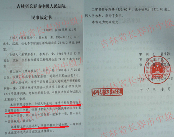 据长春中院(2019)吉01民终831号裁定书记载,孙永利没有到庭的原因是:“上诉人孙永利、李秀平经传票传唤无正当理由拒不出庭”。但据孙永利介绍:我们当时留的“邮寄地址”是位于临河街上的一个始终在正常营业的律师事务所的地址(圣豪汇商大楼603室),法官为什么不向此地址邮寄送达开庭传票呢?经我们查阅卷宗,法官就是没有给我们下达过开庭传票,卷宗里也没有开庭传票的送达回证。