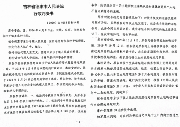 尽管米沙子镇国土资源管理分局的《说明》证明了李俭的说法,但德惠市国土局和米沙子镇政府却死不认账,也不给确权。为了维护自己的合法权益,李俭向德惠市法院提起了行政告诉。
