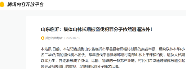 村民们向记者介绍:平邑镇老邱峪村,大约有几千亩山林,山上有各种树木以上百年的柏树最多,茂密的树林是本村老一辈留下来的财富,也是美丽乡村的基础,更是一道美丽的风景线。可是近十几年来,老邱峪村的山林不断被人盗伐,老百姓也有报案的,只是一直没有逮住盗伐柏树的贼。老邱峪村有个村民叫林本华的(小名叫二华),本村村民和村领导多次发现其盗伐林木的行为,但都因为是一个村的村民不愿意得罪他,但这却使林本华的胆子越来越大,他居然把盗伐林木当成了一条发财致富的路子,并且逐渐发展成了盗伐团伙,他们是白天采伐,夜里装三轮车去卖,形成了盗伐、运输、销赃分工明确、组织严密的一条龙产业链,而这伙人也长期以此为生,集体的林木被盗伐的就越来越多了。正所谓,法网恢恢疏而不漏,2022年4月24日晚,以林本华为首的盗窃团伙作案时,又一次被本村村委会成员逮住,其作案的三轮车也被暂扣在村委会里,但至今没有处理。老邱峪村村民听说林本华的家人正在四处找关系,担心这样下去又不了了之了,请求政府有关部门依法严惩屡屡盗伐集体林木的犯罪分子,保护好老一辈辛辛苦苦留下来的宝贵财产。