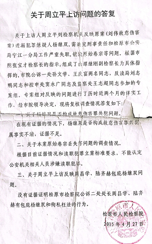 “关于上访人周立平到检察机关反映原案(刘伟故意伤害案)遗漏犯罪嫌疑人杨继双,需追究刑事责任和松原市公安局宁江一分局工作严重失职,销毁原始卷宗等问题。根据松原市检察院张宝才检察长的指示,组成了由谭继刚副检察长为具体指挥的,市检察院公诉一处孙文学、王庆富两名同志,反渎局刘志鹏同志和控申处窦永广同志及监察处王志超同志参加的专案组。专案组对反映的问题进行了历时近两个月的详实工作,经市检察院领导决定,现将复核调查情况答复如下:
