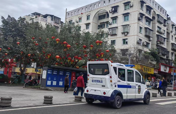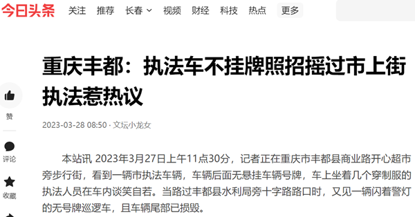 本站讯 2023年3月27日上午11点30分,记者正在重庆市丰都县商业路开心超市旁步行街,看到一辆市执法车辆,车辆后面无悬挂车辆号牌,车上坐着几个穿制服的执法人员在车内谈笑自若。当路过丰都县水利局旁十字路路口时,又见一辆闪着警灯的无号牌巡逻车,且车辆尾部已损毁。