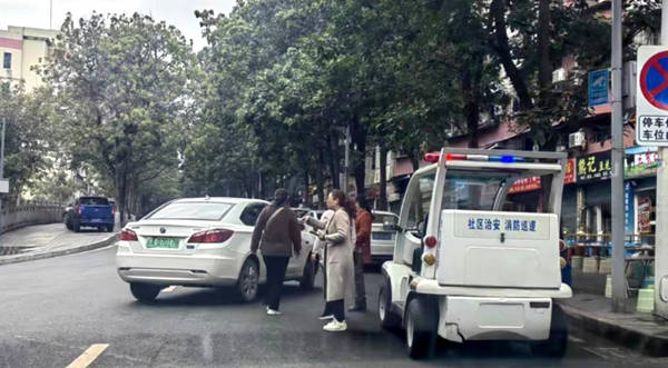 巡逻车禁停路段停靠警灯闪烁,车辆尾部擦挂严重