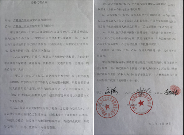 2019年,经朋友介绍,刘总将维权事宜委托给省内一家公司,双方签订了《委托代理合同》,合同约定:“一、乙方接受委托,愿意为甲方维护合法权益,在此过程中涉及的专家聘请、法律咨询、资料整理、交通食宿等一切费用,均由乙方自行负责。二、甲方以10040万(一亿零四十五元整)拆迁补偿款为标的物,愿意以其中的20%作为乙方的服务报酬。三、乙方须认真负责保护甲方的合法权益,切实履行代理义务。四、在乙方维权过程中,甲方如与犯罪嫌疑人达成和解,乙方有权要求甲方依本合同约定支付代理费。”