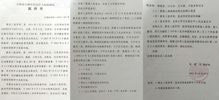 2022年 10月20日,吉林市昌邑区检察院将伤人者张学明、张红利作为被告人移送至法院,从起诉书中可以看到:“被告人张学明、张洪利于1999年2月15日在吉林市昌邑区紫光苑大酒店二楼大厅内与被害人韩炳刚发生口角后,二人持械将被害人韩炳刚殴打致伤。经吉林大学司法鉴定中心鉴定,根据《人体损伤程度鉴定标准》条款之规定,韩炳刚因外伤致中度以上失血性休克,可评定为重伤二级;韩炳刚因腹部刀刺伤致降结肠破裂,行手术治疗,可评定为重伤二级;韩炳刚因腹部刀刺伤伤伴发肠瘘,可评定为重伤二级。韩炳刚因外伤致颞骨骨折,可评定为轻伤二级,韩炳刚因外伤致左颧骨骨折,可评定为轻伤二级。根据法(司)法(1990)6号《人体轻伤鉴定标准》条款之规定,韩炳刚因刀刺伤致右侧血气胸,可评定为轻伤。”