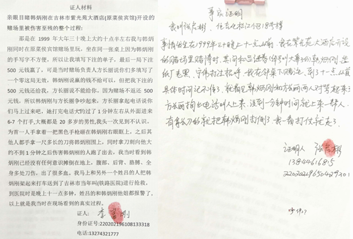 据当时在场目睹整个过程的李富刚介绍:1999年大年三十晚上大约10点多左右,我与韩炳刚同时在赌场里玩,坐在同一张桌子上,因为韩炳刚的手写字不方便,所以让我填写下注的单子,最后一局下注500元钱赢了,可当时赌场负责人方长丽说我们多填写了一个零,这局无效。韩炳刚说赢的钱不给可以,把下注的500块钱还给我。方长丽不给,说赌场不返还赌注。两个人随即争吵起来,方长丽拨通电话说:“你们马上过来吧!”大约1分钟左右,从外面进来6、7个打手,都是大概20多岁的男性,为首一人拿着一把黑色的手Q砸在韩炳刚的右眼眶上,之后,其他人都手拿一尺多长的刀将韩炳刚围上,用刀刺了大约不到1分钟之后都跑出去了,我当时看到韩炳刚瘫倒在地上没有任何意识。