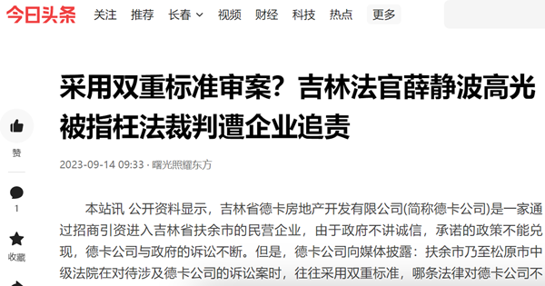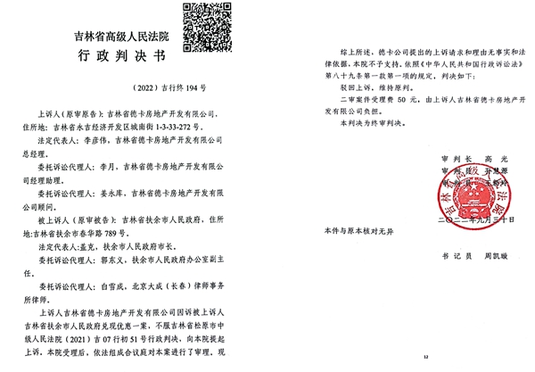 本站讯 公开资料显示,吉林省德卡房地产开发有限公司(简称德卡公司)是一家通过招商引资进入吉林省扶余市的民营企业,由于政府不讲诚信,承诺的政策不能兑现,德卡公司与政府的诉讼不断。但是,德卡公司向媒体披露:扶余市乃至松原市中级法院在对待涉及德卡公司的诉讼案时,往往采用双重标准,哪条法律对德卡公司不利,就采用哪条,这令德卡公司感到十分不公平。他们说:由于松原中院行政庭庭长薛静波、吉林省高院行政庭高光法官的枉法裁判,给我公司造成巨额损失,党中央、国务院一再强调要保护好民营企业,可是在扶余市,尤其是在扶余、松原两级法院那里,法官却与政府勾结起来坑害企业,甚至是政府与法院联手对民营企业进行谋杀!