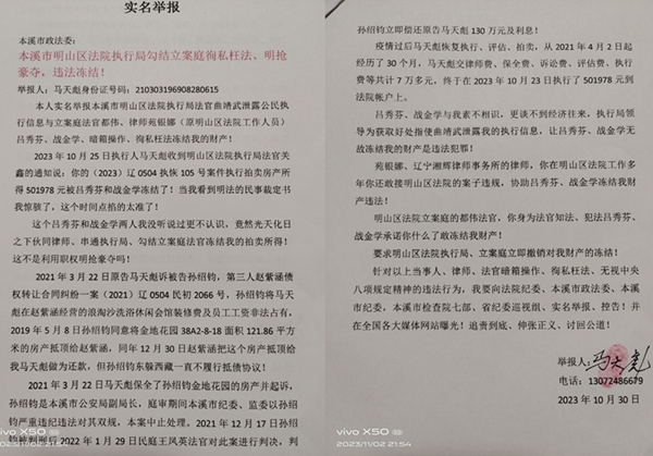 他还称:苑银娜是辽宁湘辉律师事务所的律师,在明山区法院工作多年,还接明山区法院的案子,违规协助吕秀芬、战金学冻结我的案外人财产!而明山区法院立案庭庭长都伟,身为法官却知法犯法,居然胆敢帮助吕秀芬、战金学冻结案外人的财产,真是胆大妄为!根据《刑法》第307条规定,为谋取不正当利益,以捏造的事实提起民事诉讼,妨害司法程序或者严重侵害他人合法权益的,构成虚假诉讼罪......依据此条法律,马天彪即将向辽宁省高级法院纪检委、辽宁省检查院和辽宁省政法委实名举报,要求本溪市中级法院对明山区法院立案庭、执行局的违纪违法的法官严肃处理,立即撤销对我财产的冻结!