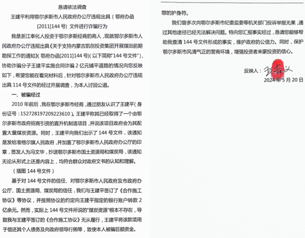 王吉义在帖文中说:我是浙江省奉化市一名退役老兵,1970年入伍,至今已有50多年了,现就鄂尔多斯市政府办公厅工作人员冯文华,违法违规出具《关于支持内蒙古凯创投资集团开展煤田前期勘探工作的通知(鄂府办函[2011]144号)》(以下简称“144号文件”),伙同诈骗分子王建平实施合同诈骗2亿多元的事实,向您反映如下: