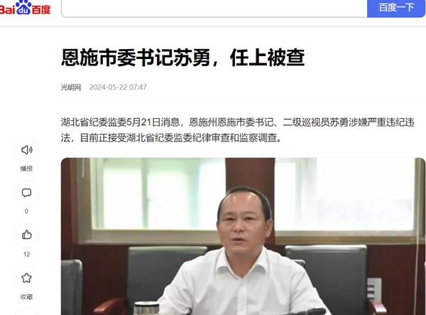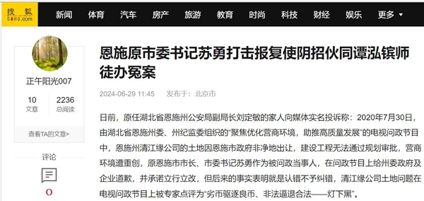 日前,原任湖北省恩施州公安局副局长刘定敏的家人向媒体实名投诉称:2020年7月30日,由湖北省恩施州委、州纪监委组织的“聚焦优化营商环境,助推高质量发展”的电视问政节目中,恩施州清江缘公司的土地因恩施市政府非净地出让,建设工程无法通过规划审批,营商环境遭重创,原恩施市市长、市委书记苏勇作为被问政当事人,在问政节目上给州委政府及企业道歉,并承诺立行立改,但后来的事实表明就是认错不予纠错,清江缘公司土地问题在电视问政节目上被专家点评为“劣币驱逐良币、非法逼退合法——灯下黑”。