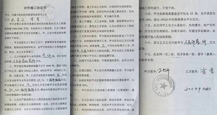 二、海伊奎煤矿灭火工程。准格尔旗海伊奎煤矿有限责任公司(以下简称“海伊奎公司”)于2004年3月注册成立,2011年4月法定代表人变更为王建平,主营煤矿开采、销售。海伊奎煤矿灭火工程于2009年8月开展前期勘察,2012年3月初步设计方案经内蒙古自治区煤炭工业局审批通过,同年8月21日经鄂尔多斯市政府批复同意开工,2014年6月至2015年完成部门前期施工审批工作,批复治理区地表面积90.94万平方米(1364亩)。2012年1月起,凯创公司先后与陈英雄、王吉义达成合作协议,共同开发海伊奎煤矿灭火工程项目1250亩,其中王吉义参与300亩,支付合作款1710万元。后该部分款项按价转化为王吉义在中金公司的股份。