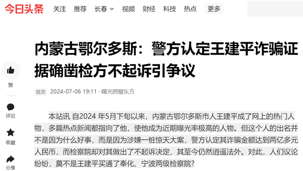 本站讯 自2024 年5月下旬以来,内蒙古鄂尔多斯市人王建平成了网上的热门人物,多篇热点新闻都指向了他,使他成为近期曝光率极高的人物。但这个人的出名并不是因为什么好事,而是因为涉嫌一桩惊天大案,警方认定其诈骗金额达到两亿多元人民币,而检察院却对其做出了不起诉决定,其至今仍然逍遥法外。对此,人们议论纷纷,莫不是王建平买通了奉化、宁波两级检察院?