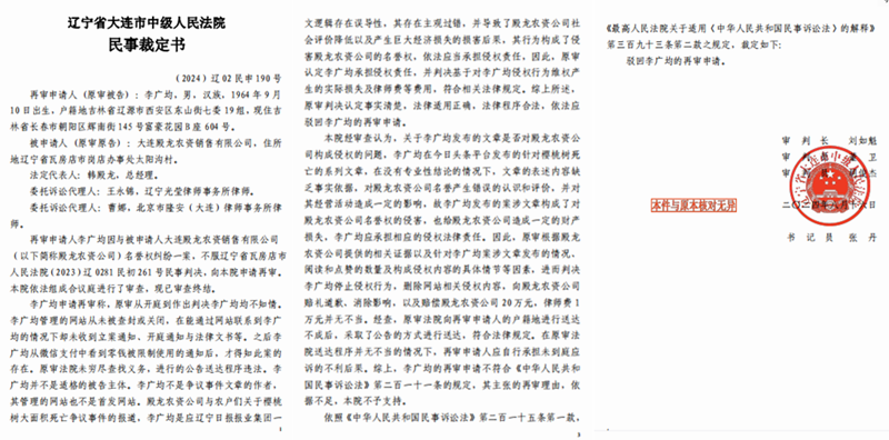 对此,李广军举出案涉文章依据的大量证据气愤的说:大连中院的裁定简直就是睁眼说瞎话,其认定案涉文章“没有专业性结论”、“缺乏事实依据”纯粹是胡说八道,是罔顾事实的枉法裁定。记者从案涉文章中看到,其陈述的事实有大量权威性的证据作为依据,有针对樱桃姐姐6#全能型涂干营养液的《分析报告》,鞍山绿洲林木果业技术鉴定有限公司出具的《技术鉴定意见书》和瓦房店市农业农村局出具的《信访事项处理意见书》等。这些权威机构均证明,大连殿龙的植保方案确有问题。其中,鞍山的《技术鉴定意见书》是迄今为止最具权威性的鉴定,该鉴定称:“纪小卫等栽植的樱桃树,栽培管理正常。樱桃树受害排除冻害、涝害、肥害、除草剂药害、杀虫杀螨剂药害、拉枝伤害、根系侵染性病害及土壤因素所致”;“受害樱桃树呈现出典型的铜离子药害症状,施用33%喹啉铜悬浮剂和23%松脂酸铜乳油是樱桃树受害的直接原因”;“所施用的33.5%喹啉铜悬浮剂和23%松脂酸铜乳油,均未在樱桃树上获得登记,属擅自扩大使用范围。”据悉,鞍山的《技术鉴定意见书》是迄今为止最具权威性的鉴定,至今没有任何机构做出更权威的鉴定意见能够否定,而大连中院的裁定硬是给案涉文章扣上了一个“没有专业性结论”、“缺乏事实依据”的大帽子,令人感到十分不解。这里要提请网友特别注意,这份裁定的审判长是刘如魁,审判员是董卫、胡俊杰。