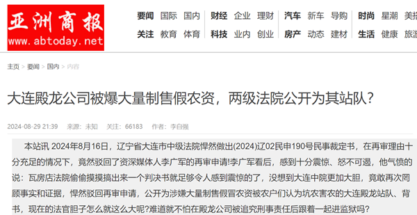 李广军介绍说:其实案涉文章所写的问题只是大连殿龙公司问题的冰山一角,农户们通过一些自媒体在网上发布的大量文章给他提供了大量新的证据,其中一篇发表于2024年5月28日的题为《大开眼界!殿龙公司19款假劣农药农资汇总,大连农业部门如此包庇》的贴文称,殿龙公司制售的19款产品都是假劣农药农资!该文章称:“每款都有产品名、生产企业名、判定为假劣的内容或依据,证据扎实,全假,有真包换。”但这篇贴文已经被删除,目前只能看到一个开头。如果此事属实,殿龙公司则涉嫌重大刑事犯罪!据了解,殿龙公司的背后,有强大的保护伞,但是铁打的衙门流水的官,谁能保证保护伞永远不倒台、不调走呢?我相信,一旦保护伞倒台了或者调走了,殿龙公司立即就会被追究刑事责任,到那时,曾经助纣为孽的人都将受到严厉的惩罚!
