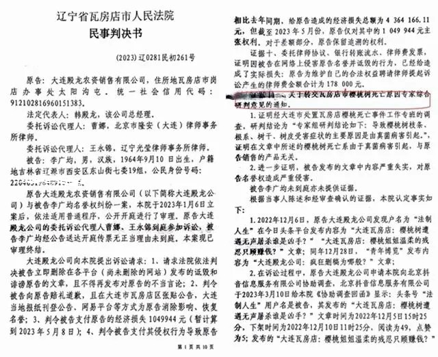 与此相反,令人感到不可思议的是,高兴利作为独审法官,却对没有任何机构盖章、没有任何专家签字承认的一张废纸十分认同。该判决书称:“2023年5月6日,大连市处置瓦房店樱桃死亡事件工作专班组织西北农林科技大学、北京市农林科学院、山东省农业科学院等单位7位专家组成专家组对樱桃树死亡原因开展研判,专家组根据现场考察情况、鉴定试验和测试报告,出具《关于瓦房店市樱桃树死亡原因专家综合研判意见》(简称《研判意见》),研判结论为导致樱桃树枝条、根系、树干树皮受害症状的主要原因是由真菌病害引起。”高并据此判决李广军构成名誉侵权。目前,这份《研判意见》早已在网上被骂的狗血喷头,在多家媒体的报道中均能看到,是一个没有任何机构盖章承认,也没有任何专家签字认账的废纸,被广大农户和律师们认为是假证、伪证,是大连市农业农村局为了袒护大连殿龙出具的遮羞布!目前,受害的广大农户还在不断的维权,不断的要求严惩大连市农业局相关官员。