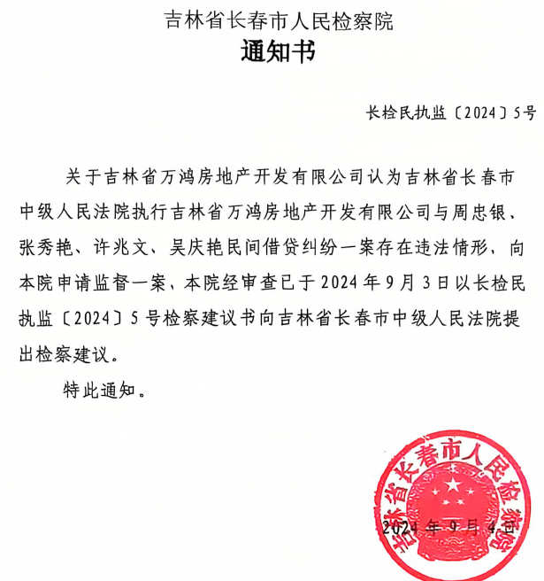 到了9月4日,长春市人民检察院给万鸿地产发来通知书(长检民执监【2024】5号),该通知书称:“关于吉林省万鸿房地产开发有限公司认为吉林省长春市中级人民法院执行吉林省万鸿房地产开发有限公司与周忠银、张秀艳、许兆文、吴庆艳民间借贷纠纷一案存在违法情形,向本院申请监督一案,本院经审查已于2024年9月3日以长检民执监【2024】5号检察建议书向吉林省长春市中级人民法院提出检察建议。特此通知。”
