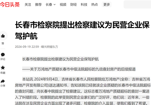 本站讯 2024年9月4日,吉林省长春市人民检察院给万鸿地产(全称:吉林省万鸿房地产开发有限公司)送达通知书,告知该院已经就该企业质疑的长春市中级法院超标的查封问题,向长春中院提出了检察建议。这标志着万鸿地产质疑超标的查封一案进入了纠错阶段。检察院的此举受到民营企业家们的广泛好评,他们说:近年来,一些法院在涉及民营企业方面出现了诸多问题,检察院的介入监督,使我们看到了希望。