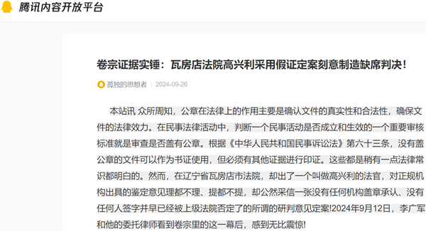 本站讯 众所周知,公章在法律上的作用主要是确认文件的真实性和合法性,确保文件的法律效力。在民事法律活动中,判断一个民事活动是否成立和生效的一个重要审核标准就是审查是否盖有公章。根据《中华人民共和国民事诉讼法》第六十三条,没有盖公章的文件可以作为书证使用,但必须有其他证据进行印证。这些都是稍有一点法律常识都明白的。然而,在辽宁省瓦房店市法院,却出了一个叫做高兴利的法官,对正规机构出具的鉴定意见理都不理、提都不提,却公然采信一张没有任何机构盖章承认、没有任何人签字并早已经被上级法院否定了的所谓的研判意见定案!2024年9月12日,李广军和他的委托律师看到卷宗里的这一幕后,感到无比震惊!