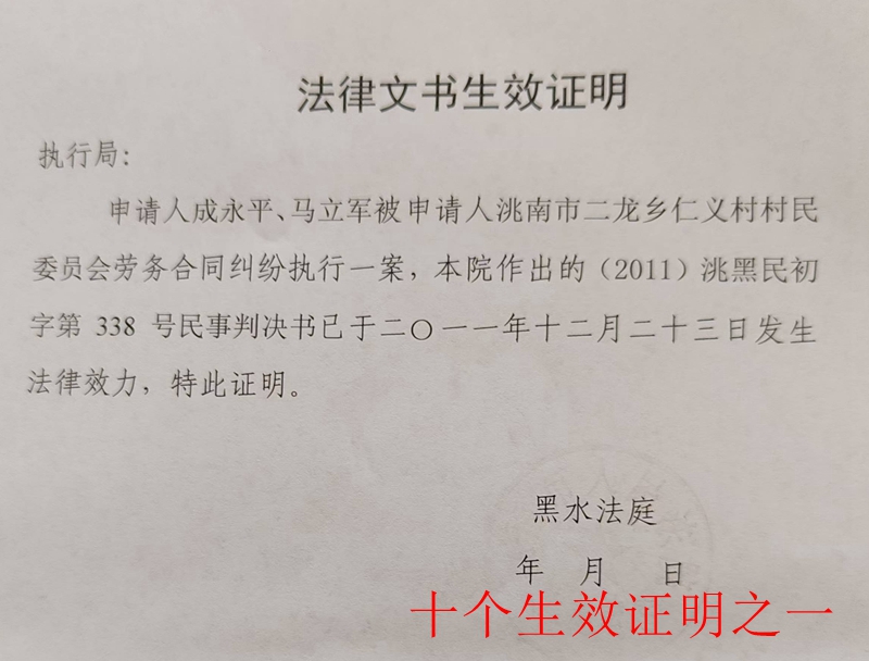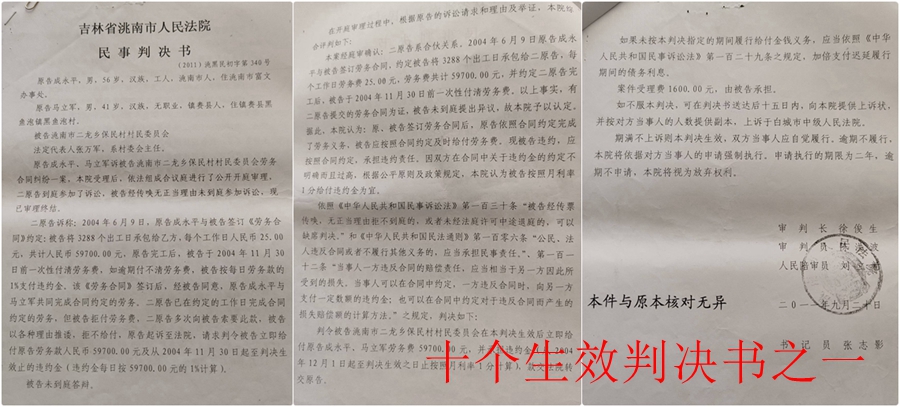 但工程完工后,乡党委书记曲春生和乡长丁立安并没有给结清劳务费,当事人成永平和马立军曾多次去二龙乡政府向曲春生和丁立安讨要无果,无奈之下,他们只好向当地法院提起诉讼。洮南市法院经过开庭审理,先后做出了(2011)洮黑民初字第333号、334号、335号、336号、337号、338号、339号、340号、341号、342号民事判决书,十个判决全部判决成永平和马立军胜诉,判决二龙乡十个村村委会于2004年11月30日竣工当日结清全部劳务合同款项共计43.3万元。令人感到十分牛逼的是,不管是二龙乡政府还是十个村的村委会,开庭时均未到庭,也未对原告的起诉提出异议。如今,十个判决书均已经生效20年之久,但洮南市法院至今未予执行,成永平和马立军赢了官司,却依旧拿不到劳务费,十个判决书已经形同废纸!他们不解,乡政府和村委会不讲诚信就够缺德的了,法律是维护社会公平正义的最后防线,怎么也这样了呢?难道法院仅仅是用如同废纸的判决书应付我们不成?(记者一刀 江枫)