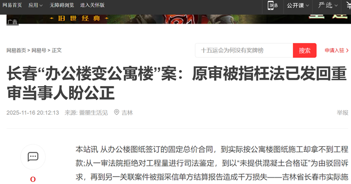 本站讯 从办公楼图纸签订的固定总价合同,到实际按公寓楼图纸施工却拿不到工程款;从一审法院拒绝对工程量进行司法鉴定,到以“未提供混凝土合格证”为由驳回诉求,再到另一关联案件被指采信单方结算报告造成千万损失——吉林省长春市实际施工人侯惠敏与长春市天泽房地产开发公司(下称“天泽公司”)的工程款纠纷,历经一审程序后陷入“维权困境”。如今,多家媒体曝光后,随着长春市中级法院以“事实不清”为由将其中一案(7343号)发回重审,侯惠敏终于看到了维权的曙光,她感谢法官的公正履职与检察机关的监督支持,期待重审能还自己一个公道。