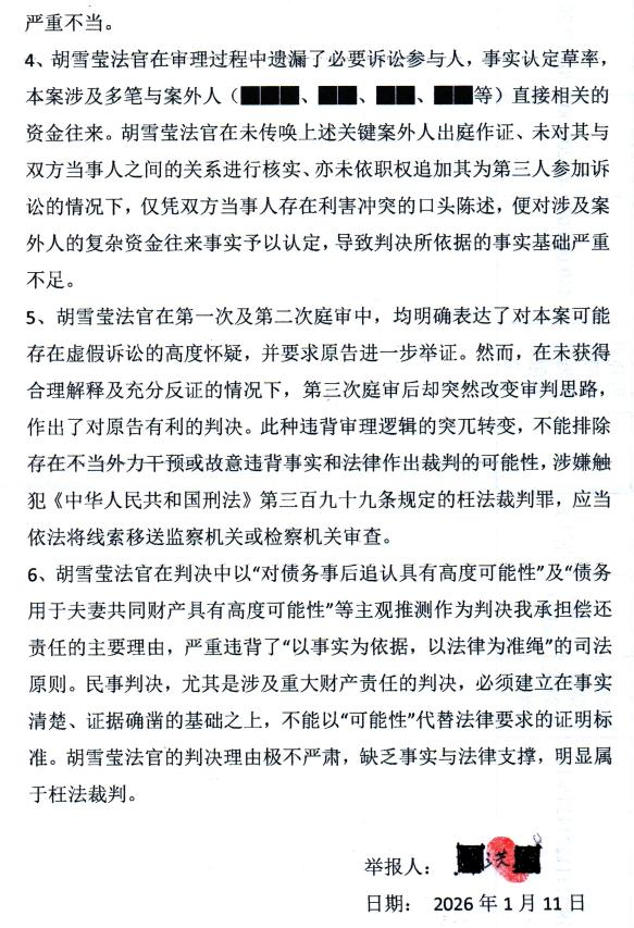 其二,法官未依法全面调查取证。胡法官在庭审中已明确表示对资金往来真实性存在怀疑,指出虚假诉讼可能性,但未依法责令原告提供完整银行流水,也未依职权调取关键证据,导致案件基础事实未查清。