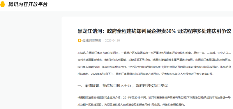本站讯 在黑龙江省齐齐哈尔讷河市,一起棚户区改造因政府一方严重违约引起的行政协议纠纷案,历经一审、二审后,企业方以二审判决遗漏重大诉求、责任划分完全颠倒、关键证据不予采信、适用法律错误等多重严重违法情形,向黑龙江省高级法院申请再审。核心事实清晰指向:镇政府构成根本违约,企业无违约却被强判30%责任;双方共同认可的司法鉴定报告被法院无故否定,形成明显枉法裁判。2026年4月8日下午,黑龙江省高级法院以问询庭方式开庭,记者和多名媒体人全程旁听了整个庭审过程。
