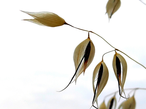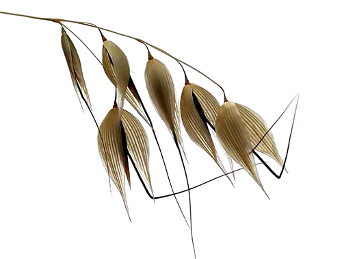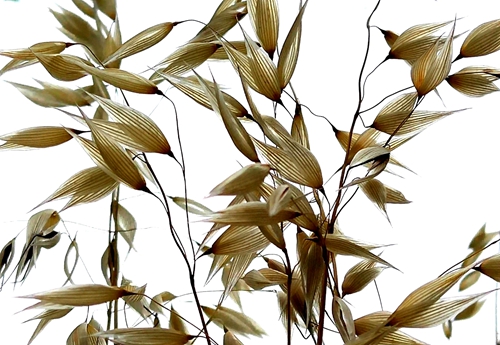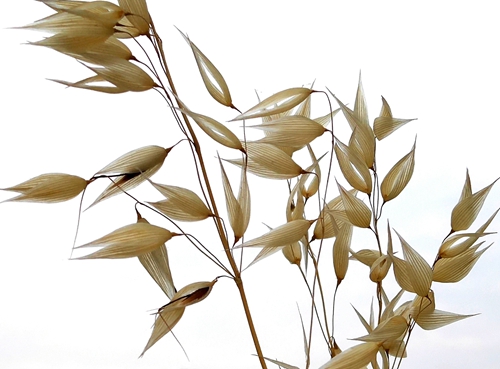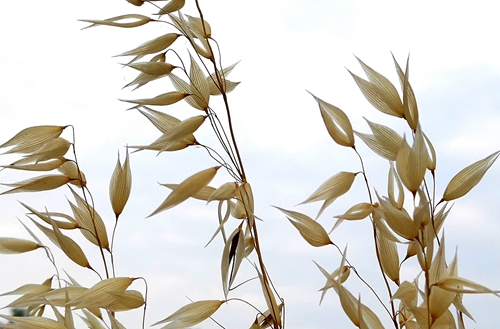 野燕麦,又名乌麦、燕麦草。秆直立,光滑无毛,叶鞘松弛,光滑或基部者被微毛,叶舌透明膜质,叶片扁平,微粗糙,或上面和边缘疏生柔毛。野燕麦花儿整个花序呈圆锥花序金字塔形,小穗柄下垂,先端膨胀,麦穗修长而疏落,一枚枚小穗分成双歧,缀着纤纤细芒,如剪得春风的燕尾般挂在细长的穗柄上,直直地垂着。麦收季节,野燕麦早熟,金黄一片为道路两旁又增添了新景。(高军摄影)