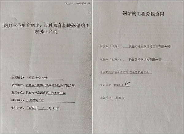 2020年4月15日,泽发公司以发包人(甲方)的身份与承包人(乙方)盛鸿公司签订了《钢结构工程分包合同》,合同约定:皓月三公里育肥牛、良种繁育基地钢结构工程定于2020年4月15日开工,2020年6月15日竣工,合同工期为60天;承包方式为“包工、包料、包施工、包质量、包工期、包试验费用、包安全及文明施工。”合同包干单价为人民币360/平方米,含税。合同注明“最后以实际面积结算,暂定面积见大合同”。