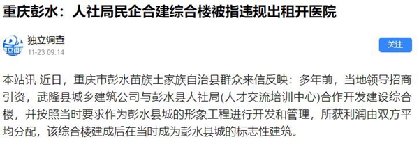 本站讯 近日,重庆市彭水苗族土家族自治县群众来信反映:多年前,当地领导招商引资,武隆县城乡建筑公司与彭水县人社局(人才交流培训中心)合作开发建设综合楼,并按照当时要求作为彭水县城的形象工程进行开发和管理,所获利润由双方平均分配,该综合楼建成后在当时成为彭水县城的标志性建筑。