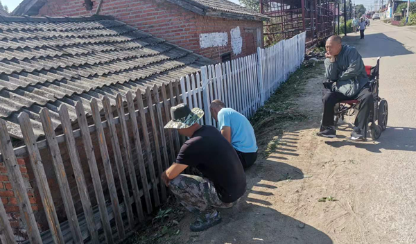 (千村示范干部为残疾农民粉刷栅栏)